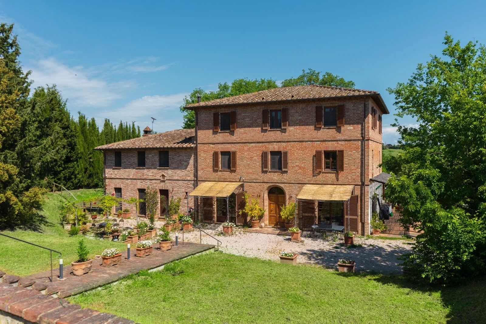 Caseverdi Villa San Lorenzo is a Tuscan dream. The Villa is situated a short distance from the charming hilltop town of Castiglione del Lago and Lake Trasimeno. Combined, the two Villas contain 10 bedrooms/11 bathrooms on 10 acres of private land filled with trails, fruit trees, event spaces, a spacious pool and views that rival any Italian postcard. The peaceful, park-like property, which sits between Florence and Rome, is within walking distance (or less than a mile drive) to the small town of Gioiella, home to a bar, market, hair salon, church, and other amenities. Three miles further afield is the legendary lakeside town of Castiglione del Lago, full of folklore, colorful streets, outdoor activities, a museum, shopping, gastronomic specialties and a majestic fortress. Lounging at the Villa is also an option for milestone birthdays, wellness or cooking/art retreats, or intimate weddings. Alternatively, create your own ideal stay that can include private chefs, cooking classes and wine tasting, relaxing at the private pool (open in season), hike down paths through fields of walnut, apple, plum, pomegranate and fig trees (feel free to pick what you can eat), enjoy a private cooking class with the villa’s fresh picked herbs or just gaze at the golden hours at the peaceful and panoramic views. Villa San Lorenzo is the perfect location for a private family gathering, destination wedding, corporate retreat or bucket list getaway with friends.